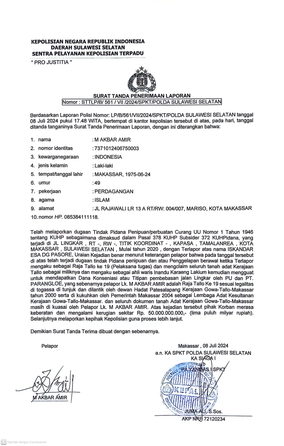 Muh. Akbar Amir Sultan Aliyah tiba di Polda Sulsel Piku 14:00 didampingi Pemangku adat lainnya. Turut hadir dalam pelaporan tersebut, diantaranya Kr. Samad, Kr. Ilham, Kr. Mattawang dan Kr. Serang.