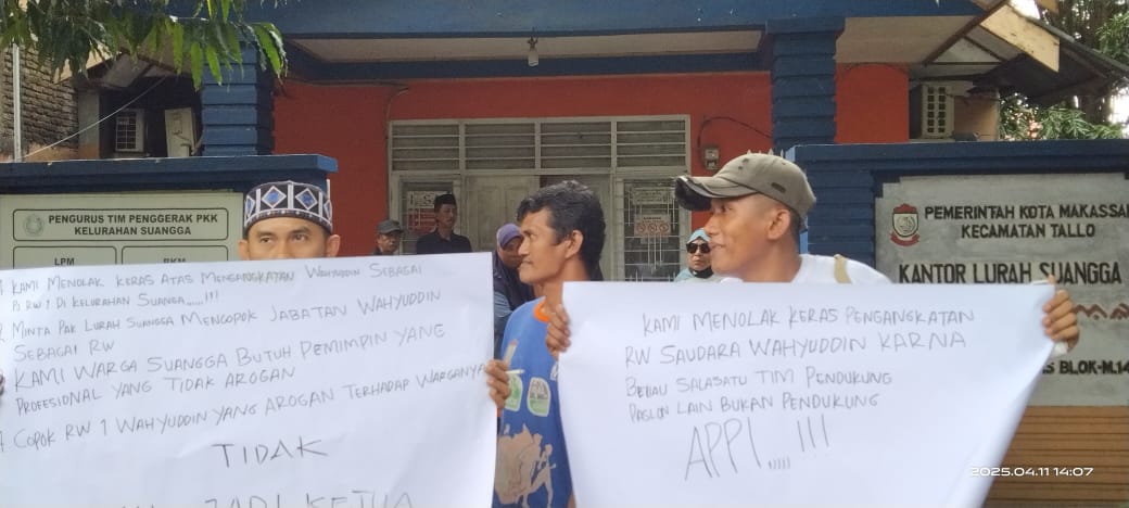 MAKASSAR, Mediator Jurnal TV– Belum lama menjadi PJ RW 01, warga menggeruduk kantor Kelurahan Suangga di Jalan Sunu Komplek Unhas Kec. tallo pada Jumat (11/4/2205).