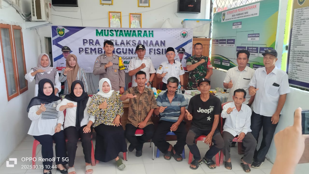 Bengkulu Selatan, Mediatorjurnaltv — Pemerintah Desa kembang Seri telah melaksanakan Musyawarah Pra Pelaksanaan Pembangunan Fisik Desa Tahun 2025 yang dilakukan di balai Desa Kembang Seri Kecamatan Pino Raya Kabupaten Bengkulu Selatan, (Rabu, 15 Oktober 2025).