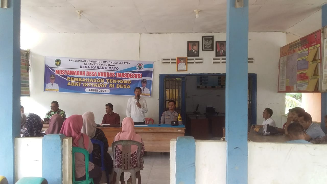 Bengkulu Selatan, MediatorjurnalTV — Pemdes Karang Cayo kecamatan Pino Raya telah menyelenggarakan Musyawarah Desa Khusus (Musdesus) untuk membahas adat istiadat. Musdesus ini merupakan forum penting bagi warga desa untuk berpartisipasi dalam pengambilan keputusan terkait pembangunan dan kehidupan desa, termasuk pelestarian nilai-nilai adat dan budaya, Rabu (30/07/2025).