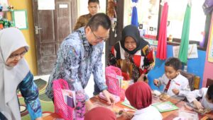 Bataralifu memasuki ruang kelas, sambil mengajak siswa SD berbincang bincang dan melihat pembagian makanan gratis di dalam kelas.