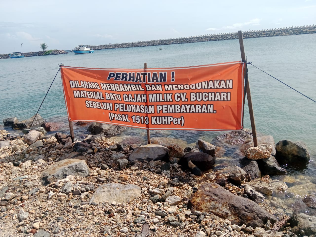 Dan akhirnya pemilik CV. Buchari terpaksa memasang spanduk dilokasi proyek SKPT tersebut dengan tulisan “PERHATIAN ! DILARANG MENGAMBIL DAN MENGGUNAKAN MATERIAL BATU GAJAH MILIK CV. BUCHARI SEBELUM PELUNASAN PEMBAYARANNYA ( PASAL 1513 KUHPer).