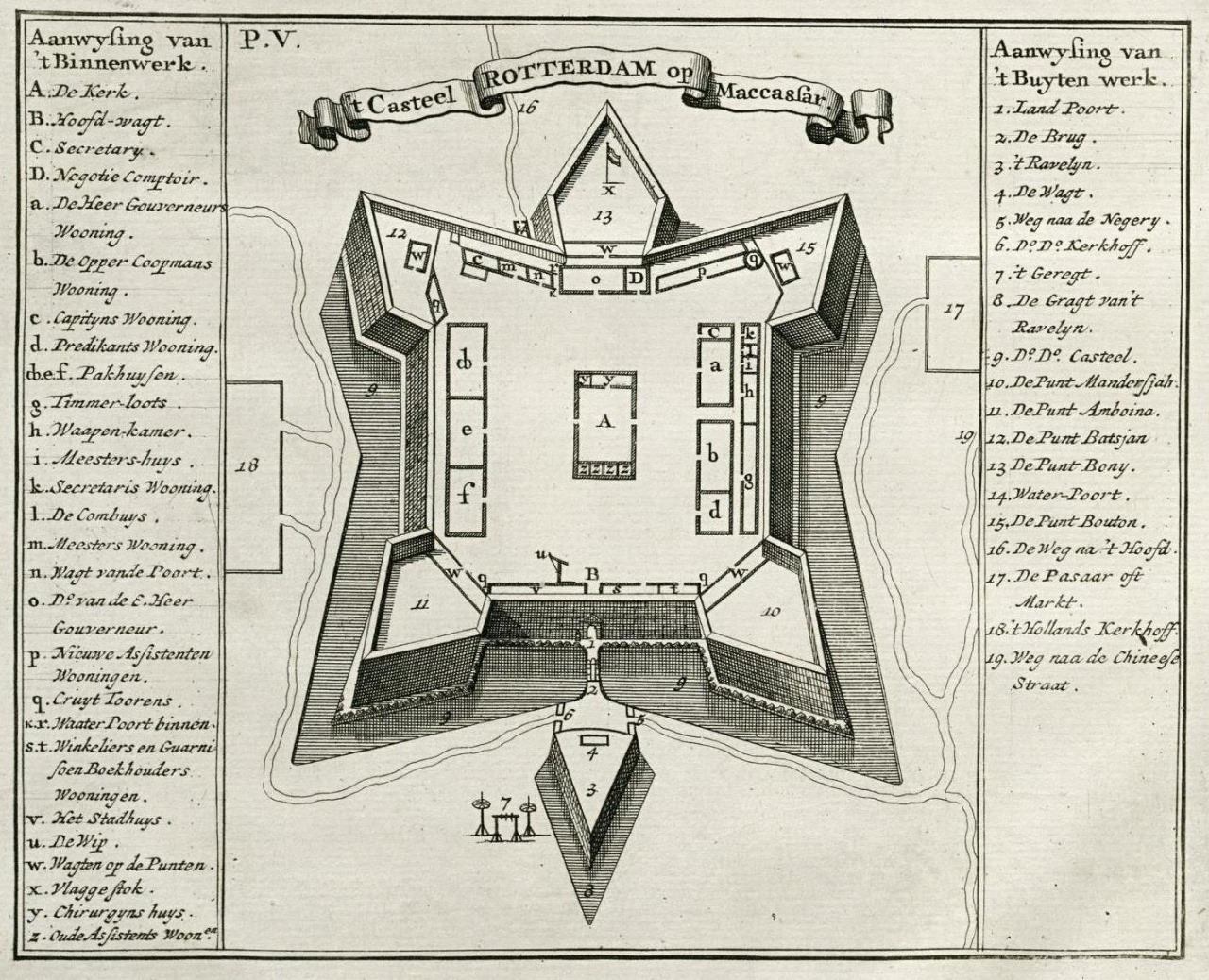 1. Bastion: Terdapat lima bastion yang terhubung dengan dinding benteng, yaitu Bastion Bone, Bastion Bacan, Bastion Buton, Bastion Mandarasyah, dan Bastion Amboina.