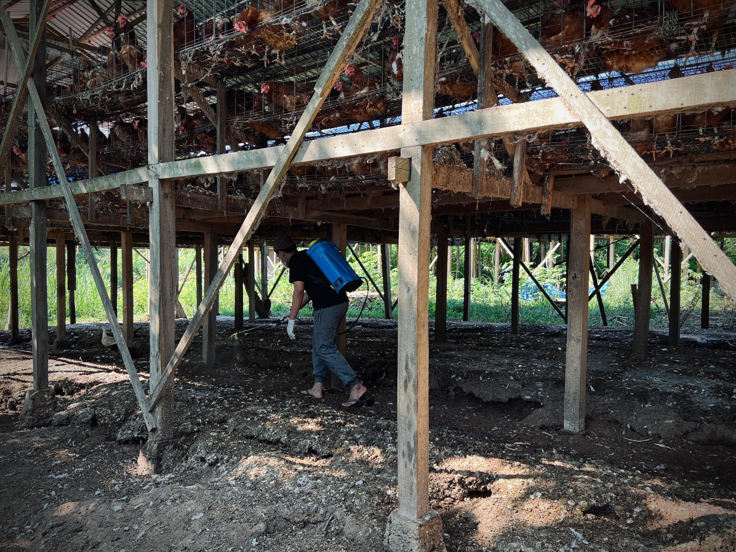 Tahap berikutnya, larutan dimasukkan ke sprayer gendong. “Kita semprot di area lantai, dinding bawah, dan bagian yang sering terkena kotoran ayam,” ujar Andin. Tim KKN mulai menyemprot perlahan, memastikan setiap sudut kandang terlapisi tipis larutan.